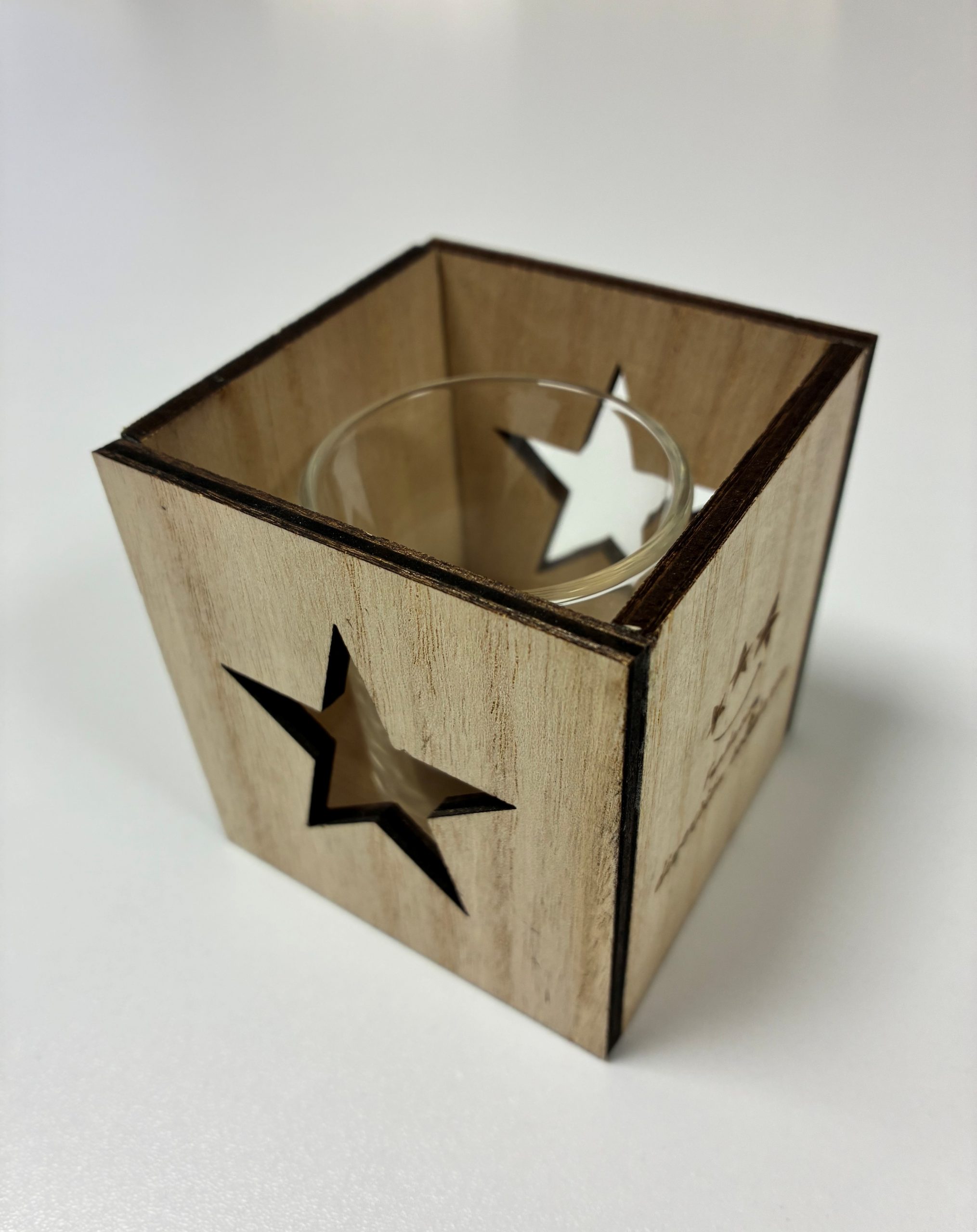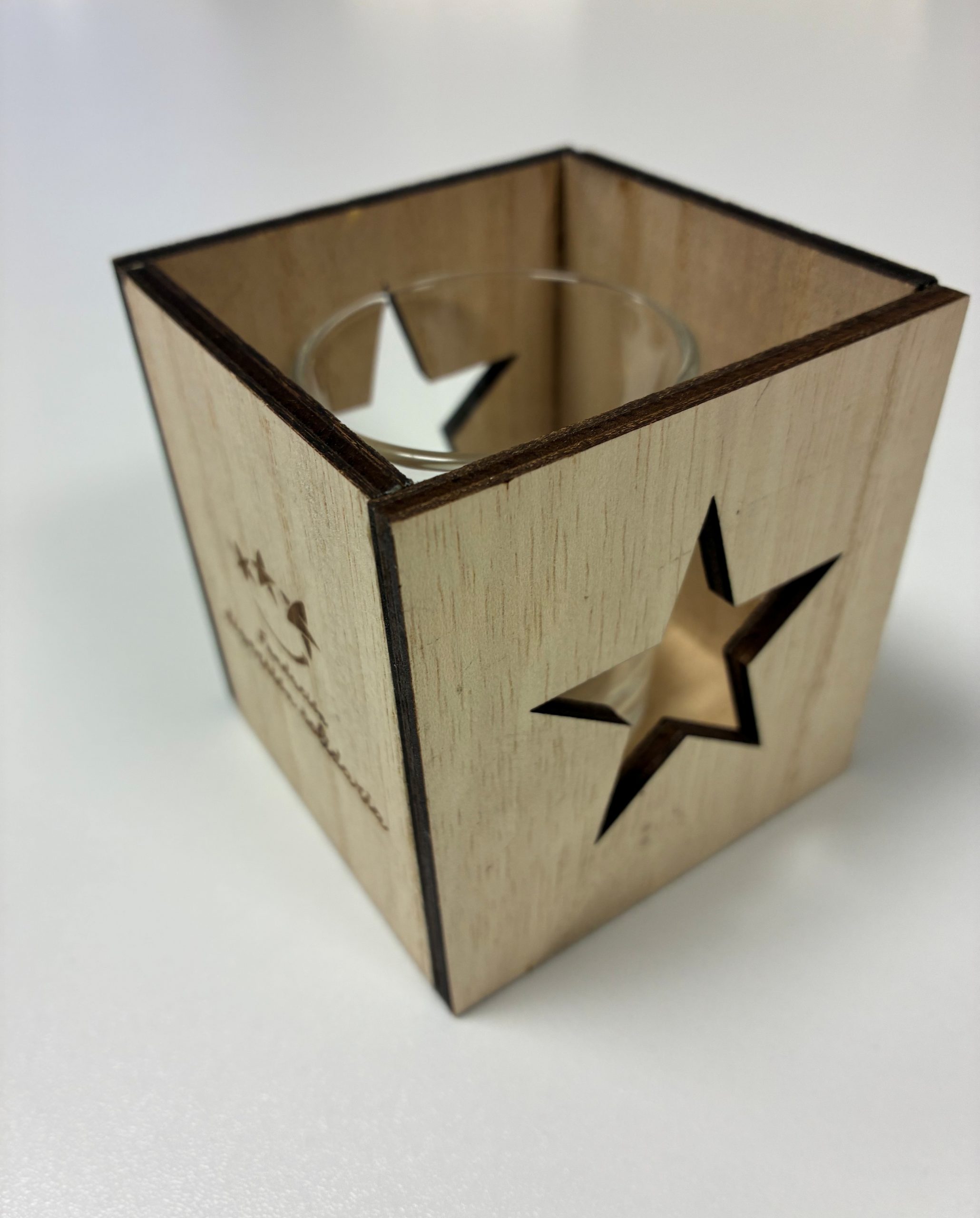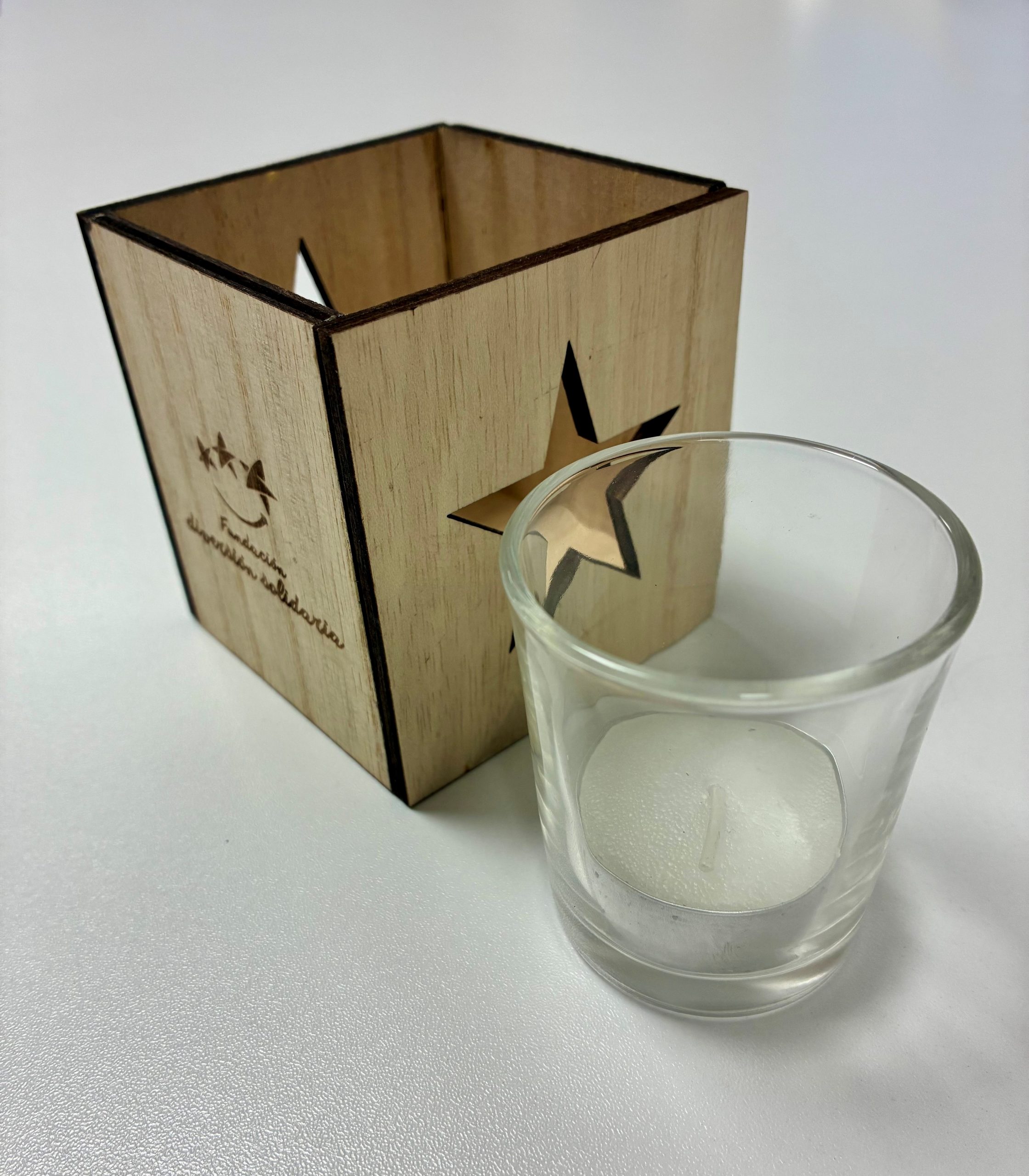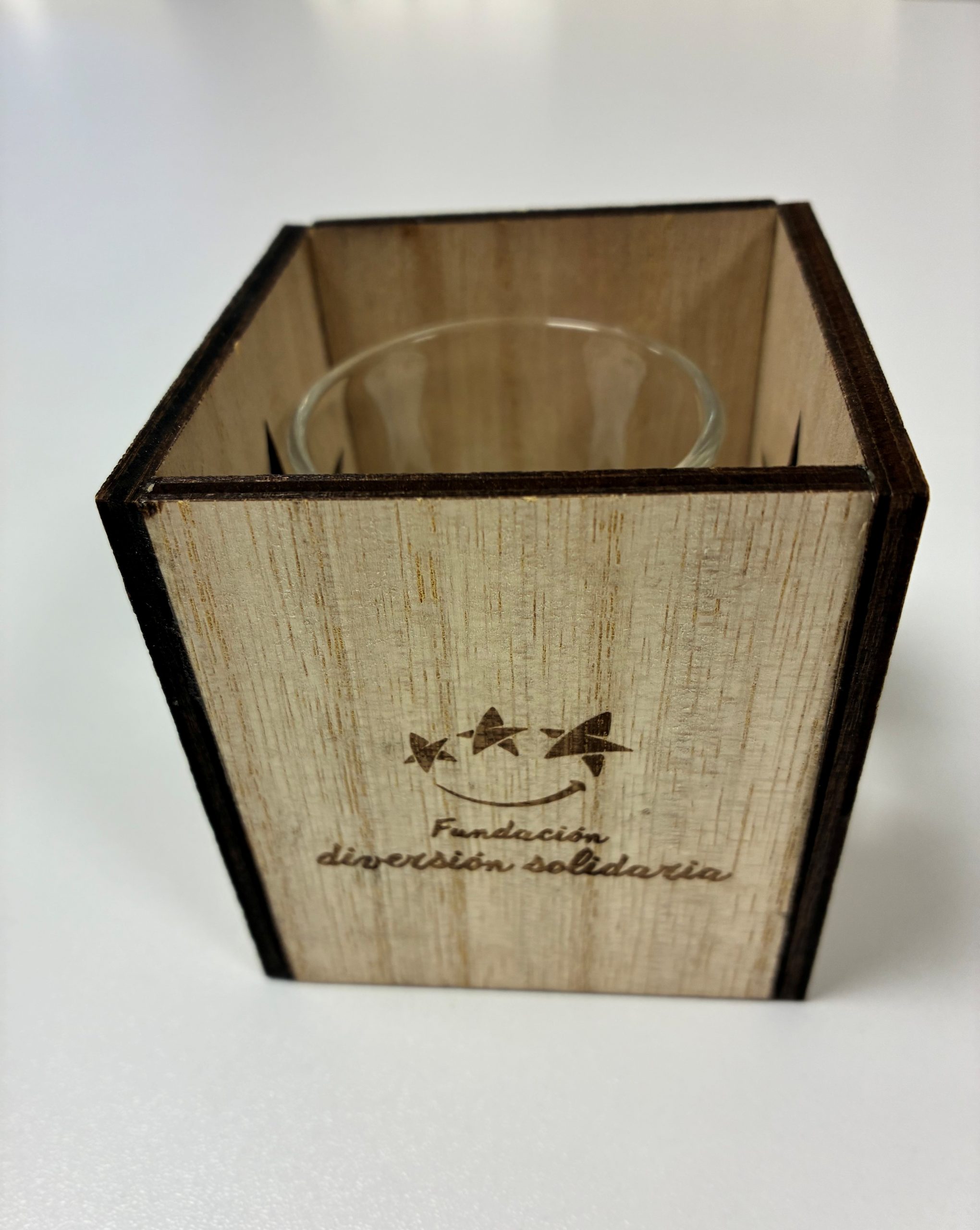 Preciosa vela aromática en recipiente de cristal y caja de madera natural. Ideal para poner una nota solidaria a tus celebraciones.
